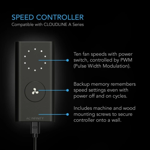 🔹 Sterownik prędkości z 10 trybami – technologia PWM zapewnia płynną regulację pracy wentylatora, od bardzo cichego przepływu powietrza aż po pełną moc. System jest kompatybilny z inteligentnymi kontrolerami AC Infinity, takimi jak model Controller 69 PRO, umożliwiającymi jeszcze bardziej precyzyjne sterowanie klimatem.