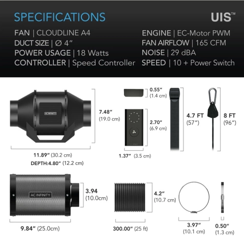 - Profesjonalny zestaw wentylacyjny AC Infinity 100mm. Wydajny wentylator, filtr węglowy premium i przewody – idealny do namiotów uprawowych.